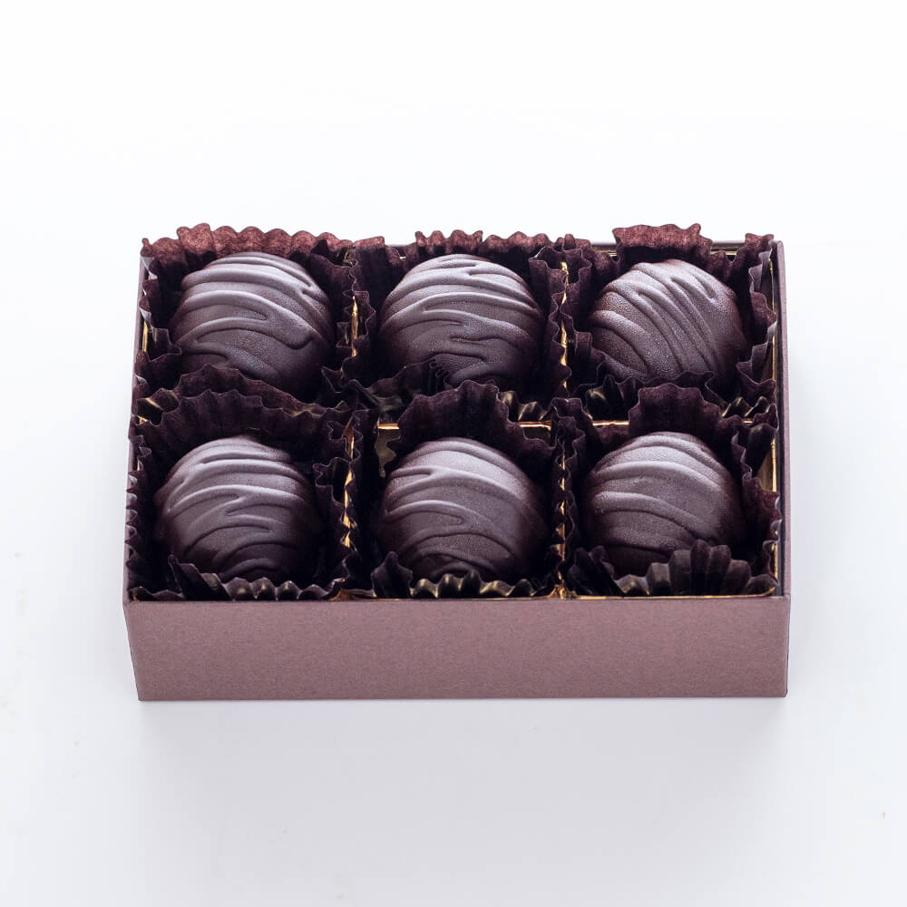 ダークラムに長期間漬け込んだレーズンを熟成ケーキで包み、さらにダークラムで追熟。ほろ苦いチョコレートでコーティングした、食べやすいサイズの「酔寿」です。